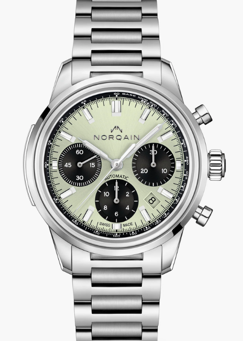 2018年に誕生したスイスの新興ブランド「ノルケイン」から登場したピスタチオカラーの文字盤を採用したモデル。黒のサブダイヤルとのコントラストも印象的です。